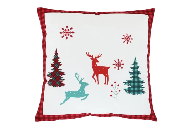Sametový vánoční dekorační polštář 45×45 cm vnese do vašeho domova kouzlo svátků. Barevné stromečky a sobi, lemované tradiční červenou kostkou, navodí veselou atmosféru během Vánoc. Polštář skvěle ozdobí pohovku, křeslo nebo postel.
