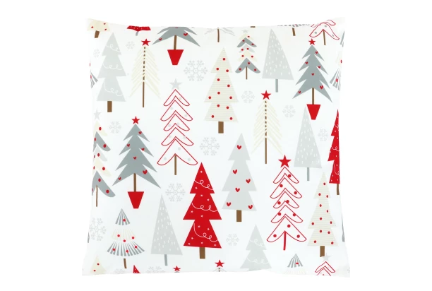 Dekorační polštář o rozměru 45×45 cm je vyroben z polyesteru, který má vzhled sametu, a proto je jeho povrch hebký na dotek. Motiv vánočních stromků na bílém podkladu vnese do každého interiéru sváteční atmosféru a zimní pohodu.