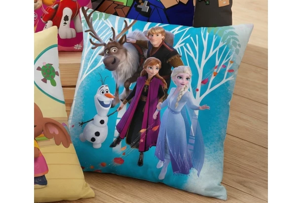 Měkký, hebký a barevný polštářek 40×40 cm s oblíbenými Disney postavami z Ledového království – Annou, Elsou, Olafem, Kristoffem a sobem Svenem – rozzáří každý dětský pokojíček. Skvěle poslouží jako kouzelná dekorace i jako pohodlný společník pro odpočinek a spaní.