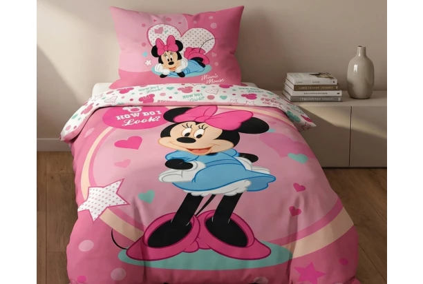 Oboustranné dětské povlečení zaujme veselým a oblíbeným motivem Minnie v modrých šatech na růžovém podkladu. Druhá, jemnější strana je laděna do bíla a zdobí ji drobné hlavičky Minnie s nápisy. Toto kouzelné ložní povlečení promění postel v pohádkové místo plné snů, krásně doplní dětský pokojíček a potěší každou malou holčičku.