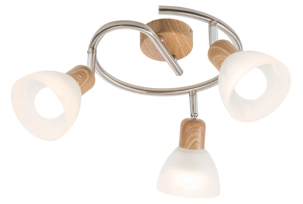 Spirálové stropní LED osvětlení ze série Daytona v nadčasovém designu je vyrobeno ze dřeva, kovu a běleného alabastrového skla, díky čemuž se lampa hodí do rustikálního i moderního interiéru. Průměr je 25 cm, varianta se 3 svítidly.