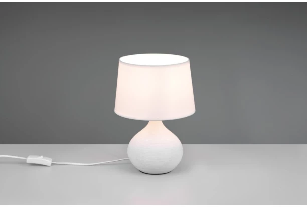 Elegantní stolní lampa v bílé barvě má keramickou základnu a látkové stínidlo. Lampička poskytne příjemné osvětlení nejen v ložnici, ale i v obývacím nebo dětském pokoji. Výška 29 cm.