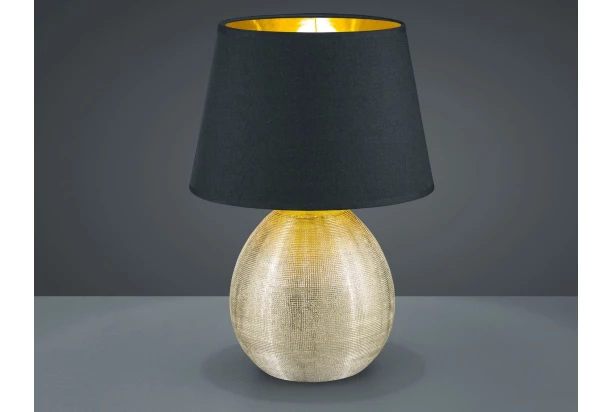 Stolní lampa s keramickým podstavcem ve zlaté barvě s jemnou strukturou dokonale ladí s černým látkovým stínidlem, které je uvnitř také zlaté. Lampička o výšce 35 cm poskytne příjemné osvětlení nejen v ložnici, ale i v obývacím nebo dětském pokoji.