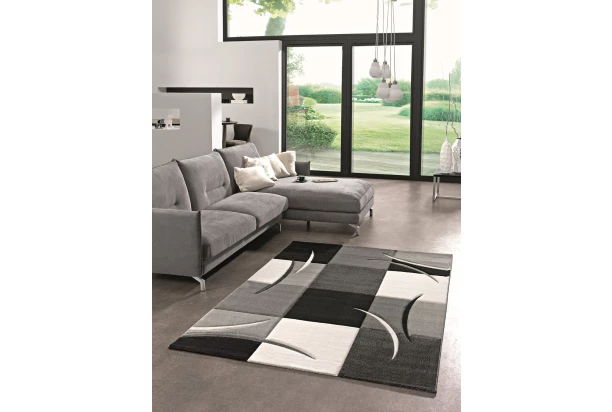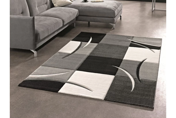 Koberec s moderním vzorem zvýrazní podlahu. Barva šedá/černá/krémová. Rozměr 80×150 cm.