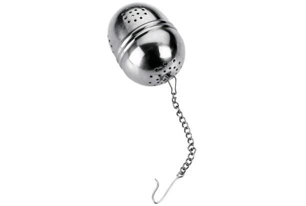 Nerezové čajové sítko ve tvaru vajíčka s řetízkem. Pro přípravu sypaného čaje.
