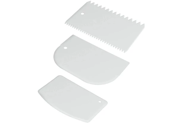 Sada obsahuje 3 praktické plastové stěrky s různými okraji. Jsou nenahraditelným pomocníkem při práci s těstem, náplní i s pěnou. Jsou navrženy tak, aby vše rovnoměrně rozdělily. Vaše dobroty pak budou vypadat ještě lépe.