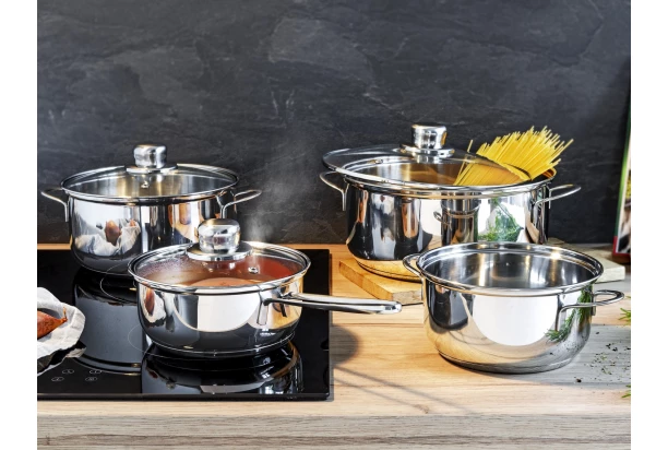 Sada hrnců na vaření v elegantním designu obsahuje celkem 7 dílů. Vyrobena z ušlechtilé nerezové oceli a skla pro energeticky šetrné a zároveň chutné vaření. Hrnce mohou být použity se všemi typy sporáků, včetně indukce.