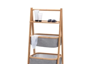 Bambusový regál s textilními košíky v elegantní šedé pozvedne design koupelny, ale i domácího wellness nebo místa odpočinku po saunování. V košících se zabydlí kosmetika a něco ke čtení, na horní odkládací ploše se bude skvěle vyjímat orosený nápoj.