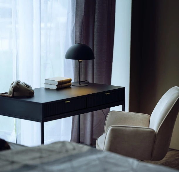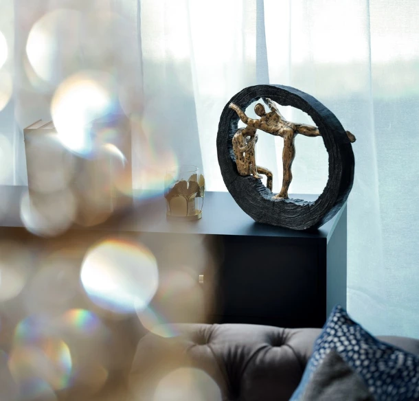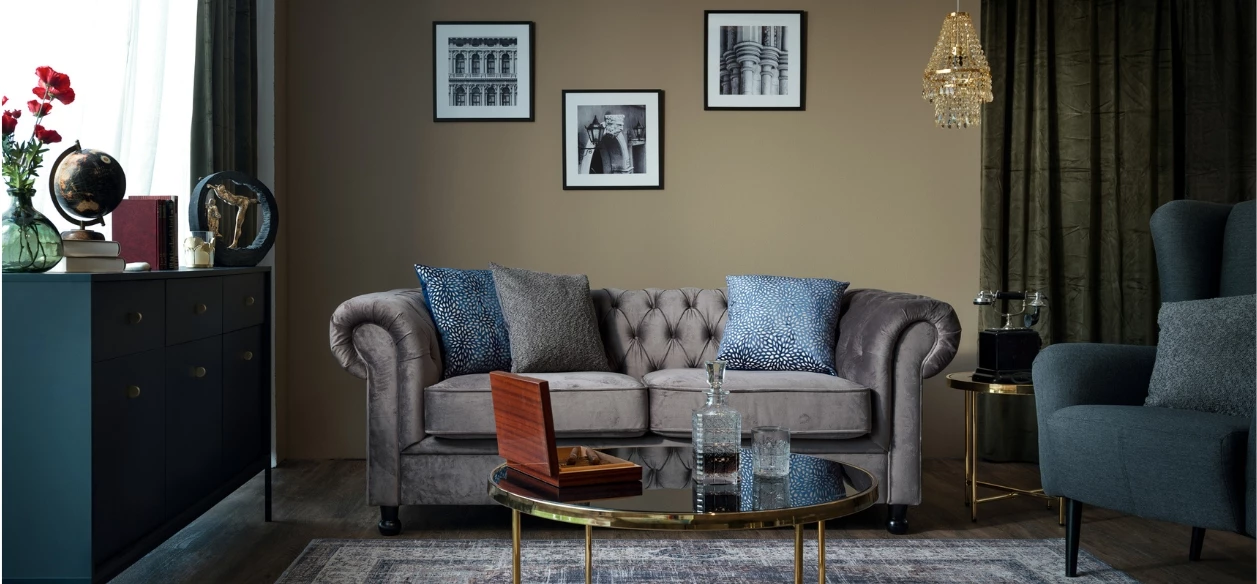 Před 55 lety vyšla kniha do té doby neznámého spisovatele Maria Puza o sicilském rodinném klanu Corleone. Autor během psaní příběh přejmenoval a pod názvem Kmotr si jej koupilo víc než 30 milionů lidí. A další miliony jsou dodnes fascinovány jeho geniálním filmovým zpracováním. Andrea posunula styl pánského pokoje s jasnou stopou nostalgie a vůní doutníků do 21. století. „Ikonická pohovka Chesterfield s prošíváním a knoflíky působí se sametovým čalouněním útulněji a vizuálně příjemněji než klasická varianta v kůži,“ říká Andrea. Oblé tvary pohovky vyvažuje minimalistická komoda s jemným zlatým detailem v podobě kování. Zlatý motiv se opakuje na odkládacím stolku s tmavou skleněnou deskou, drobných dekoracích a závěsném svítidle. Místo koberce s vysokým vlasem, který by luxusní dojem zbytečně akcentoval, Andrea použila orientální vzor s efektem vybledlých barev a celou kompozici doplnila o střízlivé, ale půvabné černobílé fotografie architektonických detailů.