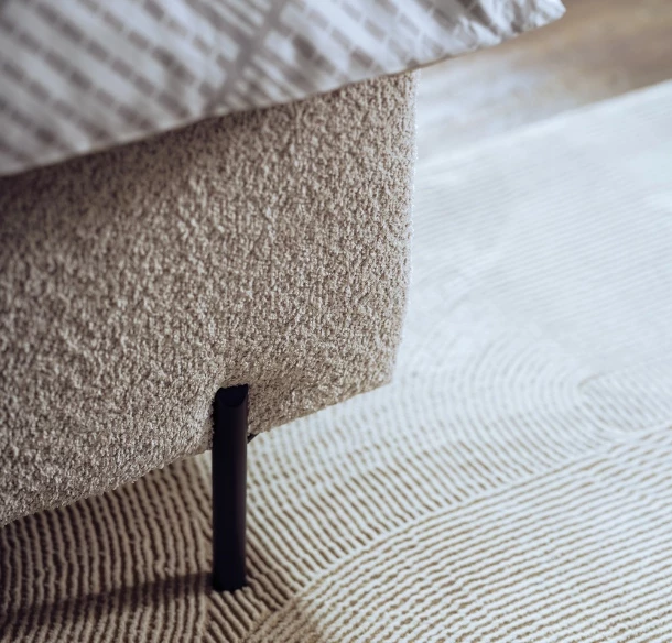 Židle svým tvarem a čalouněním elegantně navazuje na koncept, ve kterém tentokrát nehrají hlavní roli barvy. Symbolickou tečkou je pak koberec v krémové barvě s kresbou připomínající japonské zenové zahrady.
