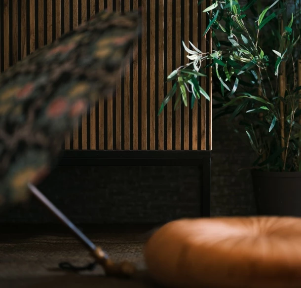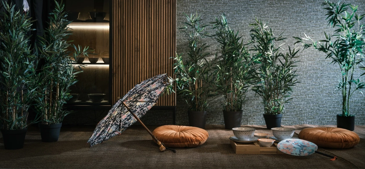 Minimalismus v japonském pojetí, křehkost porcelánu a pleti krásek ovládajících umění čajového obřadu a půvab ručně malovaných slunečníků a vějířů spojila Andrea v intimní atmosféře se stíny bambusových listů. „Marshallův film Gejša mě kromě jiných věcí z profesního hlediska samozřejmě fascinuje dokonalou scénografií,“ říká Andrea. Porcelánové misky nechala vyniknout v prosvícené komodě s lamelovými dvířky. Posezení na zemi vytvořila jednoduše z polštářků a dřevěného pořadače na příbory obráceného dnem vzhůru (pouze v obchodech).