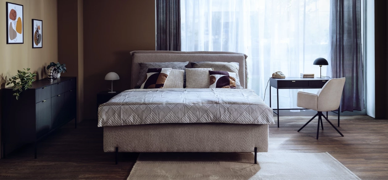Odkaz na estetiku 60. let nese ložnice, v níž se Andrea nechala inspirovat filmem Single Man z roku 2009. Úspornou barevnou paletu oživují geometrické vzory na doplňcích. „Mám tenhle příběh moc ráda, možná i proto, že jsem v duši minimalistka,“ usmívá se Andrea a upozorňuje na zajímavé struktury: „Jsem nadšená z komody a psacího stolku z řady Nova, jsou to opravdu nádherné kousky.“ Další rozměr a plasticitu vnáší do prostoru velkorysá čalouněná postel. Dvojice lamp v nadčasovém designu působí hravě a podtrhuje Andrein cit pro detail.