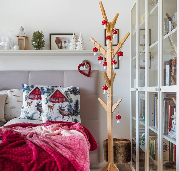 Nebudete první, kdo zatouží mít vánoční strom v ložnici. Ale takovýhle jen tak někdo nemá. Dopřejte věšáku chvilku slávy a místo svršky ho ozdobte třeba houbami , ať si užije! Do postele si nastěhujte jeleny, heboučké deky a nezapomeňte na kožešinu, ať je vstávání příjemnější.