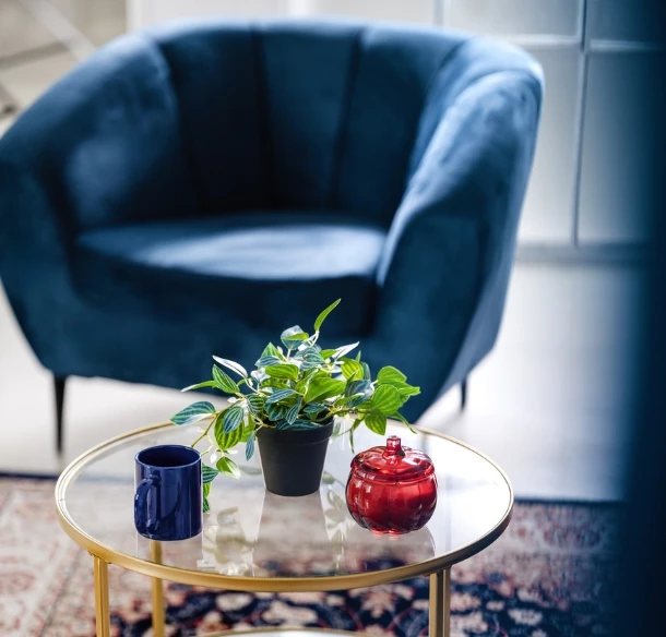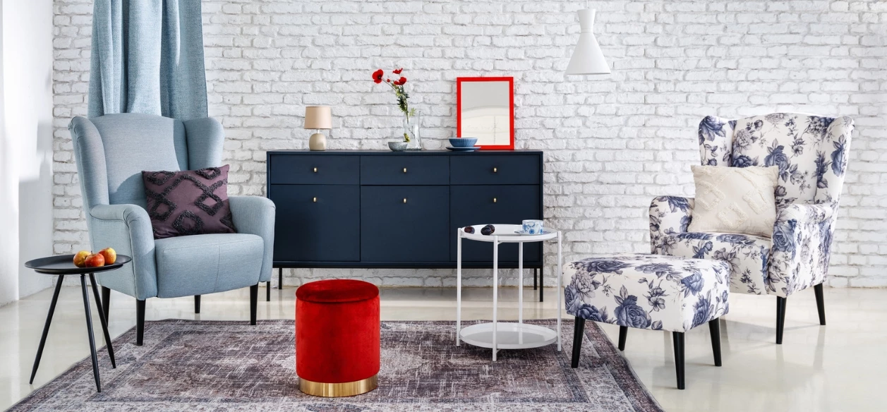 Na první pohled stejné křeslo, ale dvě různé podoby, které spolu na úvodní fotografii tohoto článku fungují překvapivě harmonicky. Dejte jasně najevo, které místo komu patří. Světle modrý ušák s tmavým dekoračním polštářem bude ideálním koutkem k vychutnání šálku čaje nebo odpoledního koktejlu a k poslechu oblíbené hudby. Romantická květinová varianta s podnožkou je zaslouženým místem odpočinku po celodenní práci na zahradě, kde si vychutnáte kávu a nic vás nebude rušit při sledování nového seriálu. Ke každému křeslu patří odkládací stolek, jednotící kov a minimalistický tvar neruší harmonii celku a jednoduchá, ale elegantní komoda Mono dodá kýženou špetku glamour. Třešničkou na dortu jsou dekorace a doplňky v energické červené barvě.