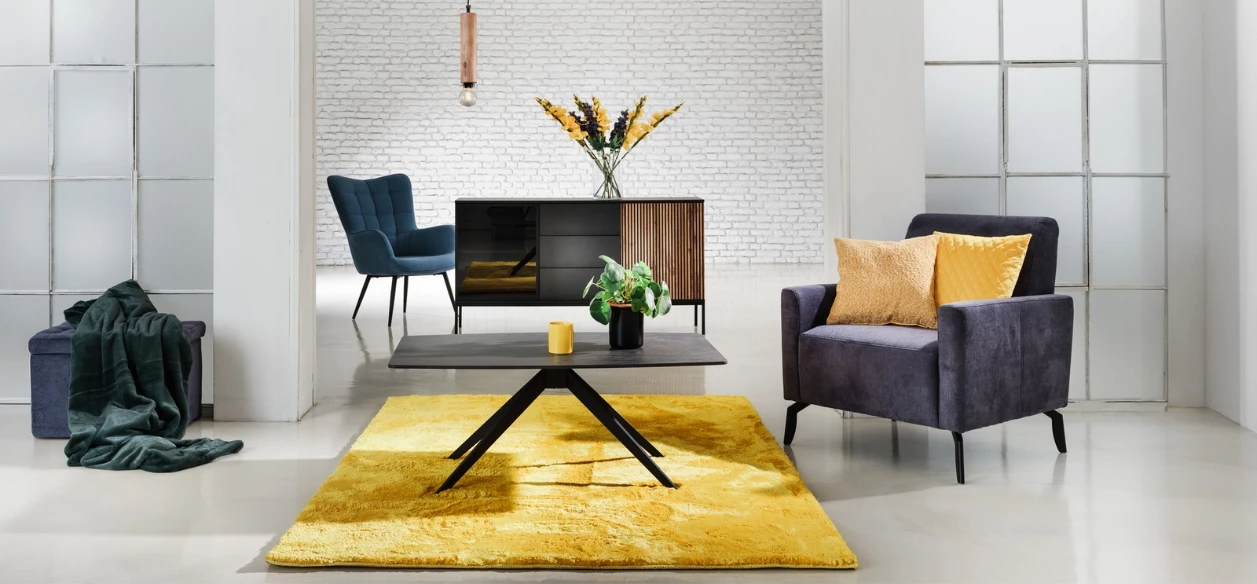 Žlutá jako kousek slunce, jako bojovník proti nudě a upjatosti, dostane novou energii vedle odstínu jasně modré. Zajímavě prošívané křeslo (dostupné pouze v prodejnách) a černá komoda s prosklenými dvířky a dřevěnou strukturou dodají interiéru další rozměr. Nezapomeňte na květiny, v našem butiku najdete velký výběr, díky němuž budete mít doma léto po celý rok.
