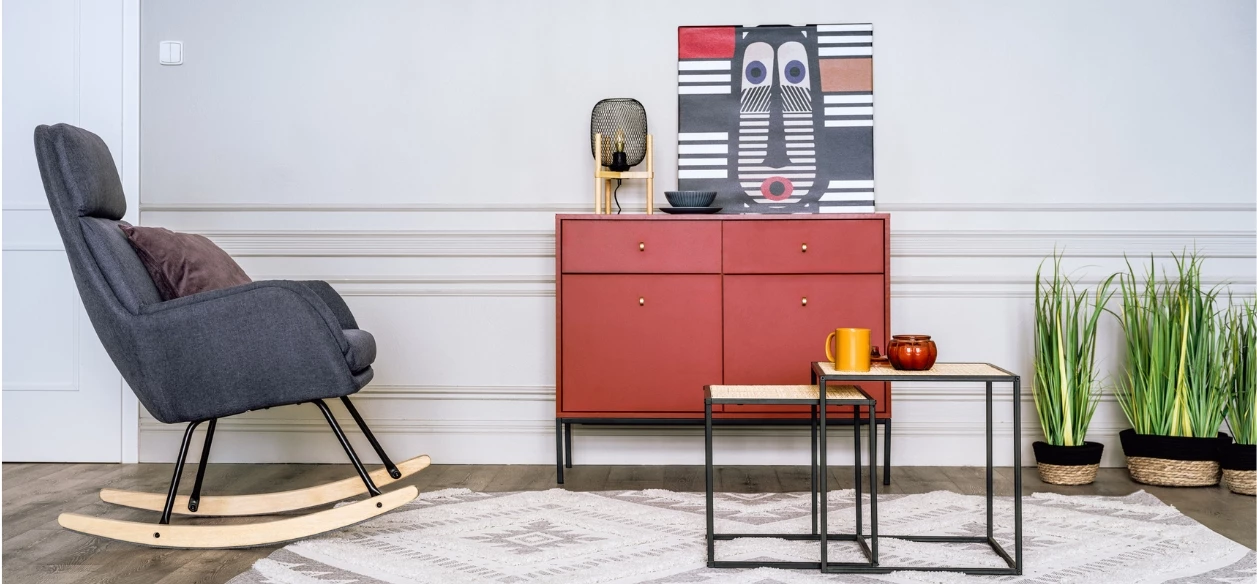 Do módy se vracejí houpací křesla. Ale vyšla z ní vůbec někdy? U nás ho najdete i v námořnické modré a věříme, že Lindberg má všechny předpoklady stát se mimořádně oblíbeným kouskem interiéru, ve kterém se bude chtít uvelebit každý člen domácnosti, o hostech nemluvě. Propojení s přírodními tóny dřeva a černého kovu sympaticky narušuje subtilnější skříňka z řady Mono, tentokrát v tlumené červené barvě (dostupné pouze v prodejnách). Interiér, který si dokážeme představit v městském bytě stejně jako na chalupě, doplňuje světlý koberec a dvojice odkládacích stolků na tenkých nožkách s horními deskami z ratanového výpletu.