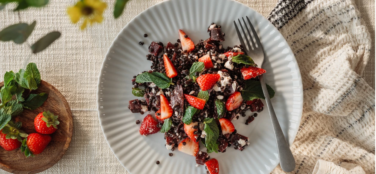 Suroviny na 4 porce: šálek čočky beluga 5 menších bulv červené řepy uvařených nebo upečených doměkka, celé balení sýra feta, hrst nahrubo nasekaných lístků máty, hrnek čerstvých jahod