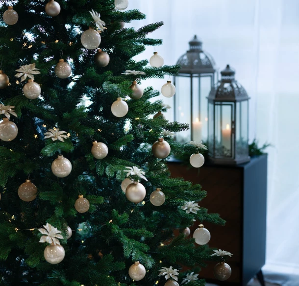 Odstíny champagne, tedy jemné krémovobéžové, jsou ideálním propojením stříbrné a zlaté. Ty jsou evergreenem vánoční výzdoby, který nikdy nevyjde z módy. Na první pohled nenápadný, ale zároveň vytříbený styl Denisa povýšila na neokázalý luxus díky kombinaci různých struktur klasických kulatých vánočních baněk. Pokud vám pastelové tóny nestačí a potřebujete prostě „trochu víc“, přidejte třpytivé květy na klipu. Stačí už jen jednoduché osvětlení stromku v teplém bílém odstínu a půvabná dekorace, která doladí zejména minimalistické a moderní interiéry, je hotová.
