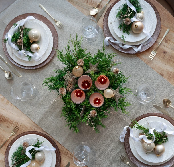 Propojte dekoraci i s aranžmá svátečního stolu. Pod mělký talíř položte větší servírovací, abyste zdůraznili výjimečnost chvíle, založte příbory ve zlatém dekoru a použijte stejné ozdoby jako na stromku s trochou přírodní zeleně a jednoduše naaranžovanou stuhou. Denisa dokáže vykouzlit originální adventní věnec téměř z čehokoliv a stejně snadno si ho můžete vytvořit i vy: třeba z jednoduché misky ozdobené větvičkami, několika ozdobami a čtyřmi aroma svíčkami.