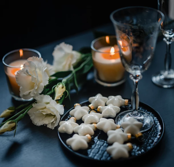Na slavnostní tabuli prostřela Denisa jednoduchý porcelánový servis bez ozdob. Misky s mechem, větvičkami a ptáčky doplňuje další kouzelně prostý symbol adventního věnce: bílé svíčky v hrníčcích s mechem. Drobné skleněné hvězdičky připomínají vánoční cukroví.