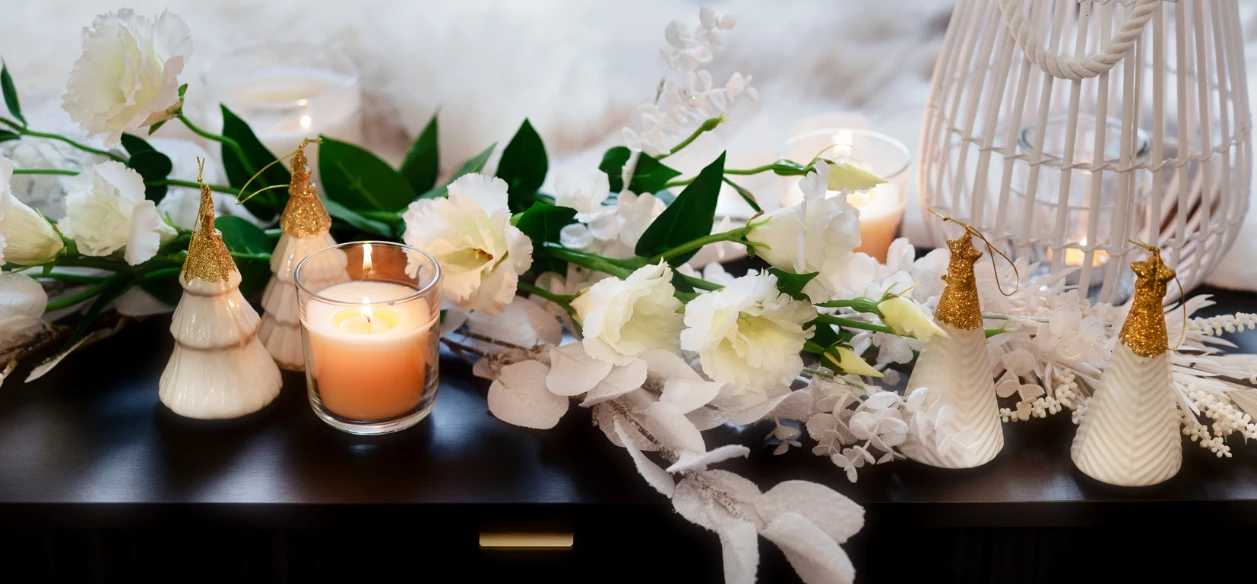 Na tmavé komodě se krásně vyjímá sněhobílé aranžmá svíček, květin, luceren a keramických stromků se zlatými detaily. Dekorací ve stejném stylu ozdobte botník v předsíni, krbovou římsu, úzkou skříňku nebo nízkou knihovnu v obývacím pokoji nebo ložnici, rám zrcadla v koupelně. Ať jsou Vánoce všude!