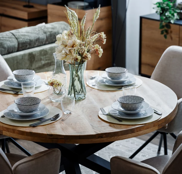 Kulatý stůl Ace vyžaduje více prostoru než čtvercový nebo obdélníkový, ale díky krásné desce z mangového dřeva se záměrně strukturovaným nerovným povrchem a masivnímu podnoží vytváří unikátní místo pro společné stolování. Luxusní čalouněné židle Miracle vyvažují mohutnou hmotu stolu a vnášejí do jídelní zóny eleganci a pohodlí. Dvojlůžko Lusaka se sametovým čalouněním a nápadným prošíváním doplňuje pocit útulnosti z celého interiéru.