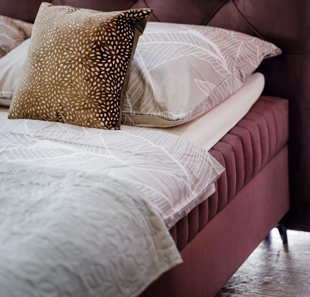 Pro oddělení ložnice, zvolila velmi subtilní optickou „zástěnu“ v podobě vysokých rostlin. „Ložnice by měla být místem klidu a regenerace. I přesto, že vám prostor neumožňuje úplné uzavření, pokuste se zachovat pocit intimity,“ říká Andrea. V reálném interiéru by Andrea zvolila postel v jednodušším designu, velkorysý prostor prodejny jí umožnil prezentovat komfortní a luxusní dvojlůžko s úložným prostorem a čalouněným čelem.
