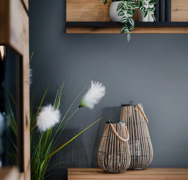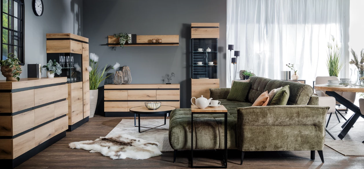 Odpočinkový prostor rámují komody, vitríny a police z programu Corte v přírodním dekoru dub coast. Poskytují dostatek úložného prostoru a díky kombinaci prosklených a uzavřených polic je tu místo i na oblíbené umělecké předměty, které chtějí mít majitele stále na očích.