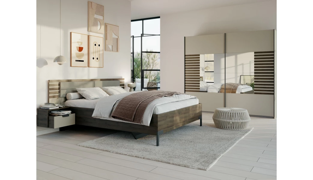 Kolekce Barea – nábytek do ložnice v moderním lamelovém designu nabízí praktičnost i kvalitní zpracování. Tento trendový nábytek v kombinaci tmavě šedých nebo béžových ploch s dubovým dřevodekorem vytváří stylové akcenty. Čelo postele doplňuje měkké čalounění, které působí atraktivně a zároveň poskytuje pohodlnou oporu při čtení nebo sledování televize. Zavěšené noční stolky s odkládací přihrádkou a zásuvkou působí vzdušně a také umožňují snadnou údržbu podlahy v prostoru ložnice. Posuvné dveře skříně umožňují snadný přístup do vnitřního prostoru a doplňují je zrcadla, která opticky zvětší prostor uvnitř místnosti. Vnitřní bloky skříně můžete libovolně doplnit dalšími policemi a naopak vnější konstrukci skříně lze navíc doplnit okrasným paspartovým rámem. Na drobné prádlo můžete využít také praktickou úložnou skříňku.