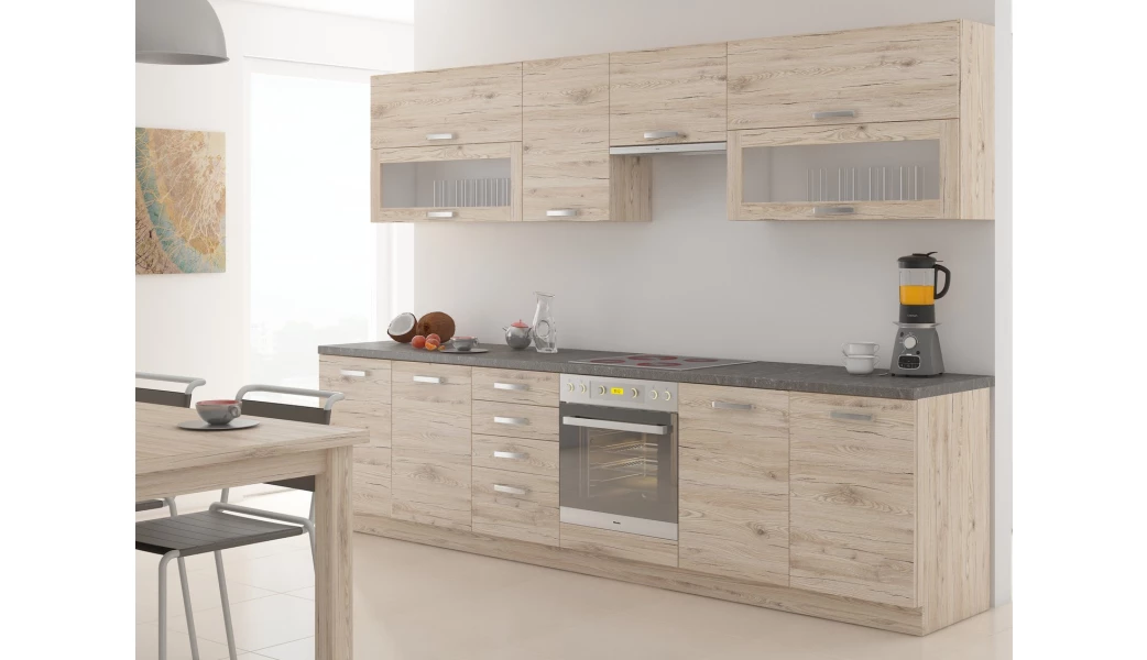 Program kuchyně Bordeaux – kuchyňský nábytek v dřevodekoru dub bordeaux působí útulně a zároveň je velmi univerzální. Jednotlivé elementy z tohoto kuchyňského programu můžete mezi sebou různě kombinovat a sestavit si tak kuchyni podle vašich představ a prostorových možností. Poskládat si tak lze kuchyni krátkou, dlouhou, rovnou, rohovou anebo případně i do tvaru U.