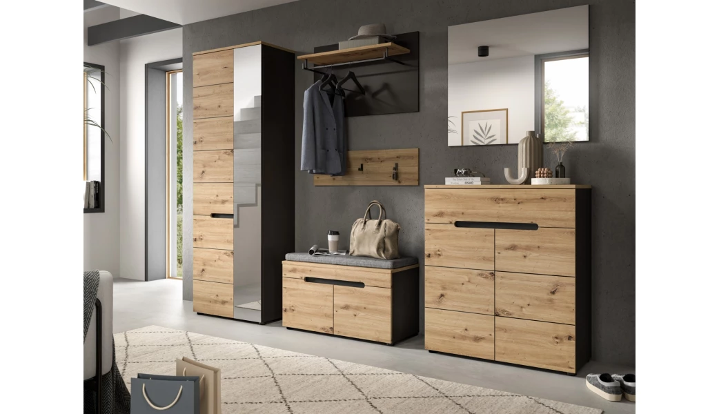 Kolekce Cano – moderní nábytek, kde se snoubí praktičnost a nadčasová elegance. Rovné přímočaré linie dodávají nábytku moderní charakter, zatímco zaoblené detaily vytváří elegantní harmonický kontrast. Tmavě šedé plochy v kombinaci s dřevodekorem dub artisan působí navíc velmi útulným dojmem. Z jednotlivých elementů této řady si snadno zařídíte interier podle vašich představ a zároveň prostorových možností. Tento nábytek je ideální volba pro ty, kteří hledají nadčasový styl, který je estetický i funkční zároveň.