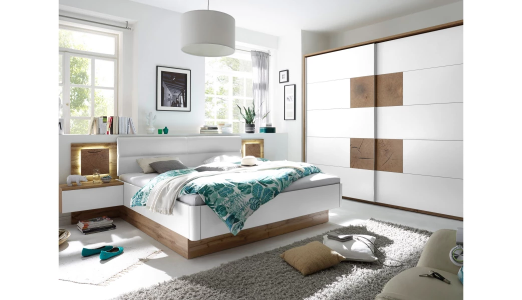 Designová kolekce ložnice Capri – optika rozpraskaného dubového dřeva zaujme na pohled a působí jako přírodní dekorativní prvek. Nábytek s hnědými akcenty dřevodekoru a výraznými suky tak vytvoří dokonalé prostředí pro útulně zařízený domov. Komfortní postel se zajímavým osvětlením v ložnici vynikne. Objemná šatní skříň může být doplněna vnitřními policemi, mechanismem s brzdou pro tlumené dovírání posuvných dveří a navíc i bočním paspartovým rámem, který zvýrazní celý design skříně. Pro ukládání drobného prádla může posloužit i praktická komoda se středovými zásuvkami.