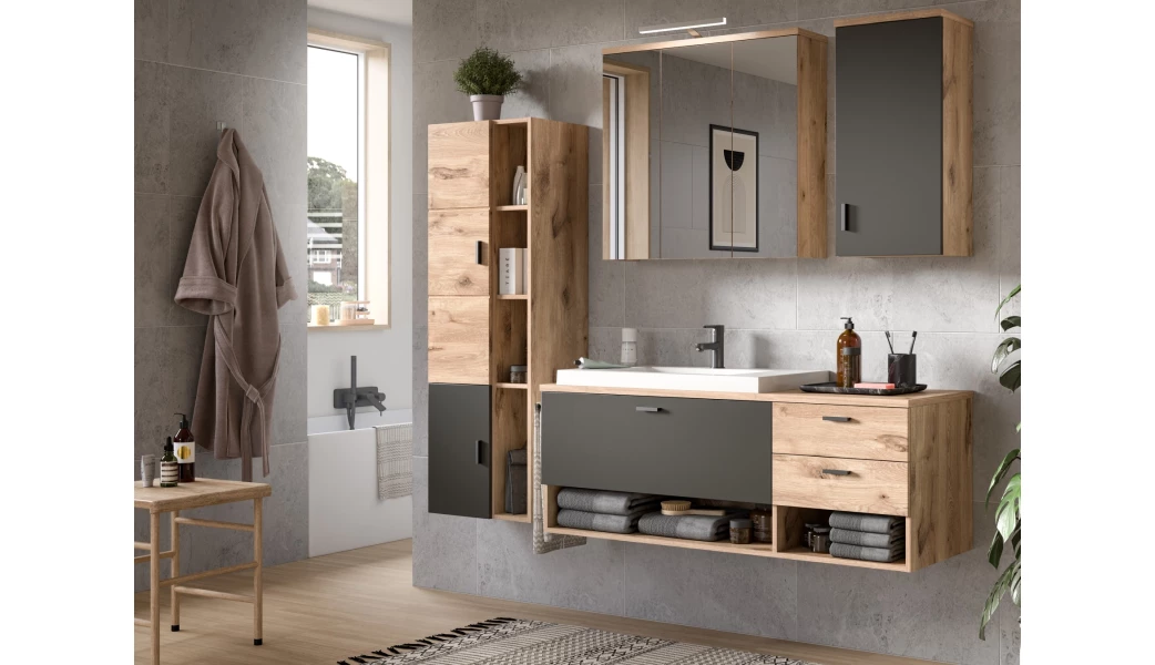 Koupelnový program nábytku Grado – objevte skvělou kombinaci moderního stylu a praktického využití pro váš domov. Nábytek v dřevodekoru dub nox s šedými plochami působí v prostoru koupelny útulně. Skříňky jsou vyrobeny z kvalitních materiálů a mají stabilní a odolnou konstrukci. Snadno udržovatelné povrchy umožňují snadné čištění a údržbu, což zaručuje dlouhou životnost. V otevřených přihrádkách a vnitřních úložných prostorech najdete dostatek úložného prostoru pro uložení koupelnových potřeb, kosmetiky nebo třeba ručníků. Díky zavěšení na stěnu můžete snadno udržovat podlahu v prostoru koupelny.