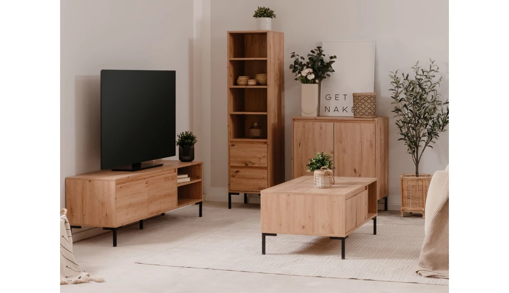 Kolekce Korsika – trendový nábytek v dřevodekoru dub artisan zútulní prostor celého bytu. Členité horizontální linie doplňuje černá kovová podnož, díky níž můžete snadno udržovat podlahy anebo využívat robotický vysavač. Z jednotlivých elementů této řady můžete uceleně v jednom stylu zařídit celý obývací pokoj, chodbu nebo jídelnu.