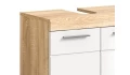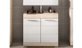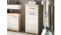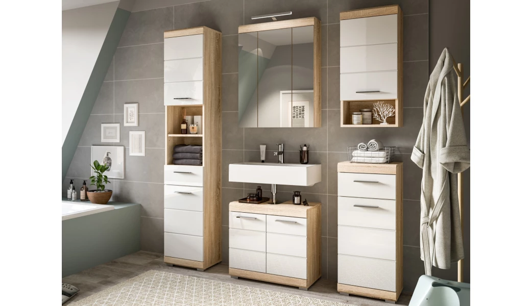 Koupelnová řada nábytku Lambada – moderní, nadčasový a zároveň praktický nábytek do koupelny v kombinaci dub sonoma s leskle bílými přední plochami. Přední plochy se zkosenou hranou a decentně frézovanými liniemi jsou příjemným detailem. Solidní zpracování a použité materiály jsou vhodné pro používání ve vlhkém prostředí koupelny, což zaručuje dlouhou životnost. Z jednotlivých elementů si můžete zařídit koupelnu podle vlastních představ a potřeby. Můžete využít jen skříňku pod umyvadlo anebo vysoká skříňku pro všestranné ukládání věcí anebo všechny skříňky najednou pro maximálně praktickou koupelnu.