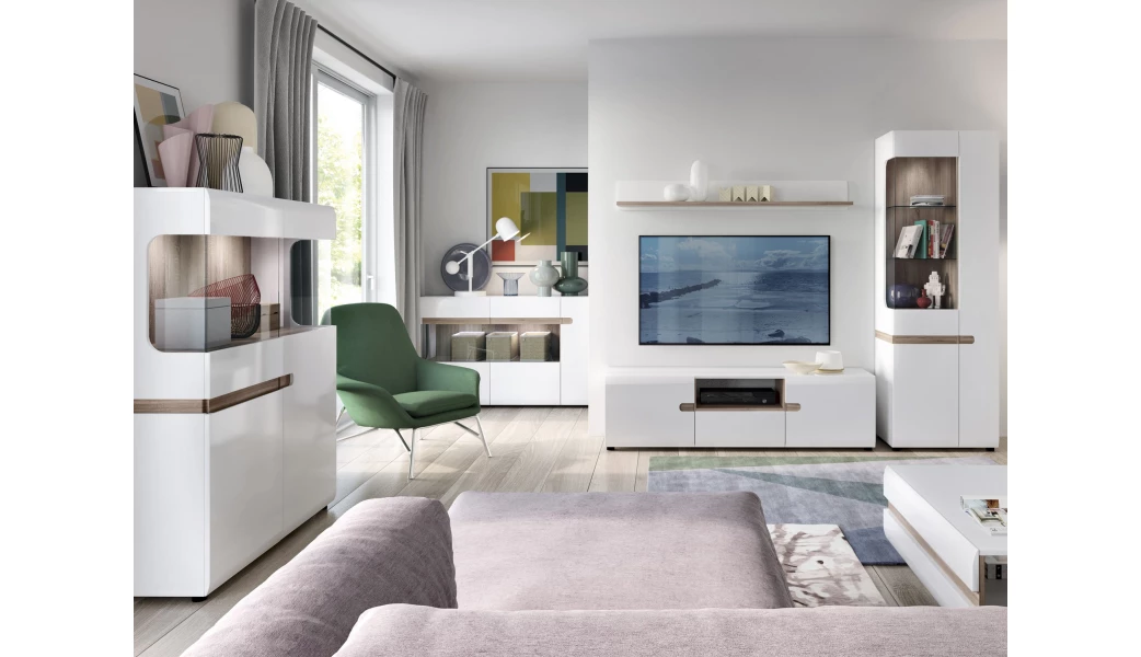 Nábytkový program Linate – stylový nábytek se zaoblenými liniemi působí velmi elegantně. Dřevodekor dub Truffel vytváří s lesklými bílými plochami příjemný kontrast a dokonale se hodí do moderně zařízeného bytu. Rohové panoramatické prosklení navíc dodá interieru vzdušnou atmosféru.