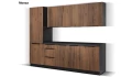 Kuchyňská sestava Monza – elegantní kombinace dřevodekoru ořech okapi a černé matné barvy působí moderně a zároveň vytváří útulnou atmosféru. Minimalistické podélné úchyty z černého matného kovu jsou nadčasové a skvěle pasují do každé moderně zařízené kuchyně. Jednotlivé elementy z kuchyňského programu Monza můžete mezi sebou různě kombinovat a sestavit si tak klasicky rovnou kuchyni nebo ve tvaru L anebo případně ve tvaru U. Ze široké nabídky jednotlivých skříněk si snadno poskládáte praktickou kuchyni podle vašich představ a prostorových možností. Kuchyňskou řadu Monza lze také navíc kombinovat se skříňkami z kuchyňské řady Arona – získáte tak ještě větší výběr.