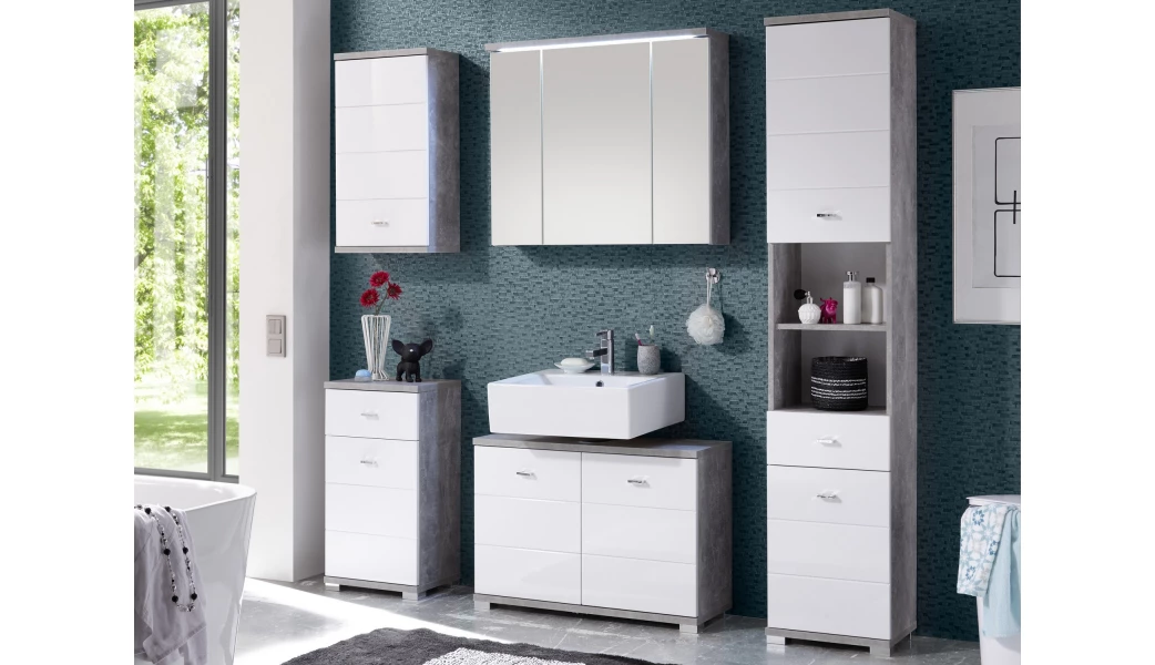 Sestava nábytku z řady Pool – praktický nábytek v imitaci šedý beton s bílým leskem předních ploch se hodí do moderně zařízené koupelny. Jednoduše moderní design dotváří vodorovné rylování s lesklé úchytky.