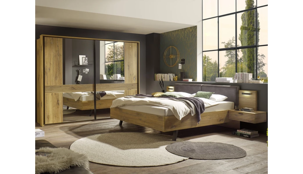 Ložnicová kolekce Trattino – stylový nábytek pro ty, kteří chtějí mít ložnici zařízenou moderně, prakticky a zároveň útulně. Příjemné tóny dubového dřevodekoru doplňují profilované povrchy, které vytváří na předních plochách zajímavý lamelový efekt. Postel o velikosti lůžka 180×200 cm má komfortně vypolstrované čelo, boční LED osvětlení a prakticky zavěšené noční stolky, díky nimž je údržba podlahy snazší. Prostorná skříň o šířce 270 cm má snadno posuvné dveře se zrcadly, za kterými najdete šatní tyče a police. Vnitřní prostory skříně lze navíc libovolně doplnit dalšími policemi nebo vnitřním zásuvkovým elementem na drobné prádlo. Skříň můžete navíc doplnit okrasným paspartovým rámem pro masivnější efekt. Do ložnice se bude hodit i úložná komoda s prakticky dělenou vnitřní zásuvkou.