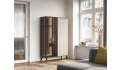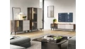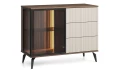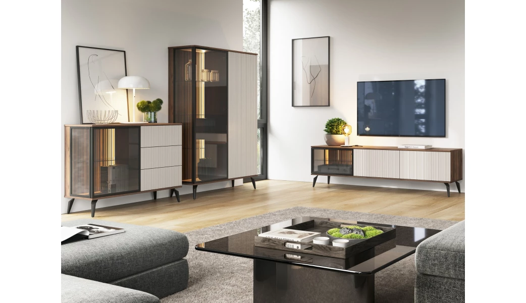 Kolekce Vici – stylový nábytek pro ty, kteří chtějí mít interiér zařízený moderně, prakticky a zároveň útulně. Hřejivý ořechový dřevodekor doplňují kašmírově béžové povrchy. Charakteristickým prvkem je profilace na předních plochách, které nábytku dodávají hloubku a originální texturu. Prosklená část s LED osvětlením nechá vyniknout vašim dekoracím a vytvoří v interiéru útulnou večerní atmosféru. Díky vysokým kovovým nožičkám působí skříňka lehce a umožňuje snadnou údržbu podlahy, včetně využití robotického vysavače.