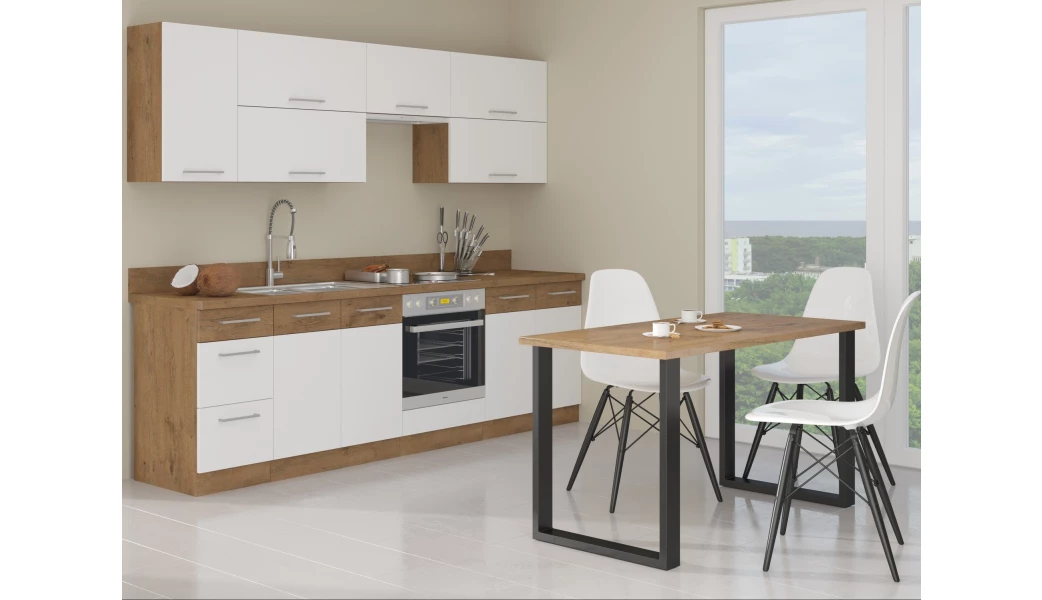 Kuchyňská sestava Vigo – moderní kuchyně v bílém lesku s dubem, lze snadno naplánovat z pohodlí vašeho domova s možností kombinace elementů mezi sebou. Můžete si tak poskládat nekonečně dlouhou kuchyňskou linku.